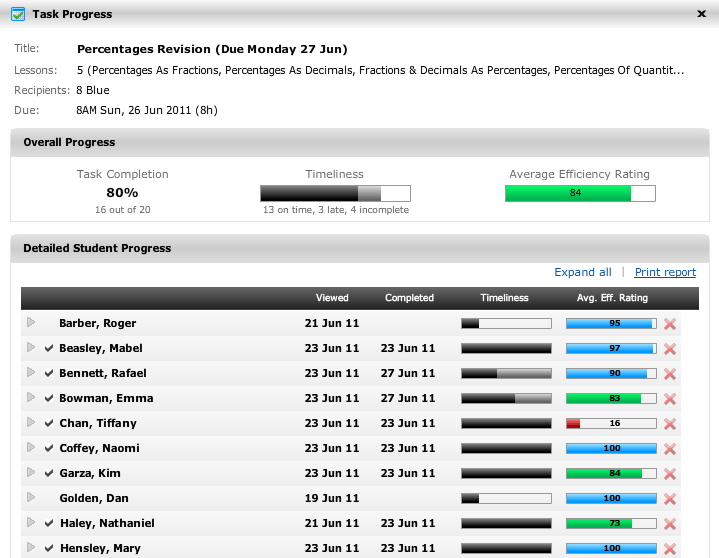 The progress details of the task then appears in a pop-up box. Teachers can check the percentage of the class that has completed the task, the timeliness with which the task has been completed as well as the average mark that is being achieved by the students on that task.